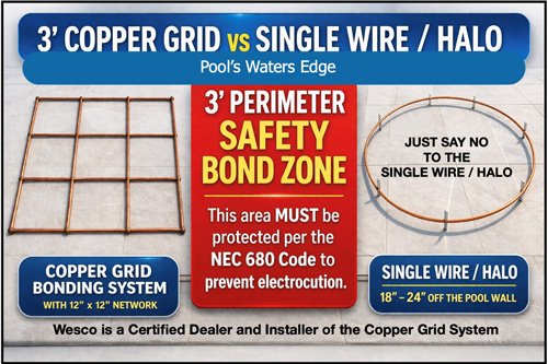 At Wesco, we have always insisted that the single wire / halo bond was Not Safe and therefore we have Only used the Copper Conductor Grid System for many years. But sadly even though it’s 2026, East Tennessee is still under the old 2017 NEC Article 680 Code which Still Allows the Single Wire / Halo.